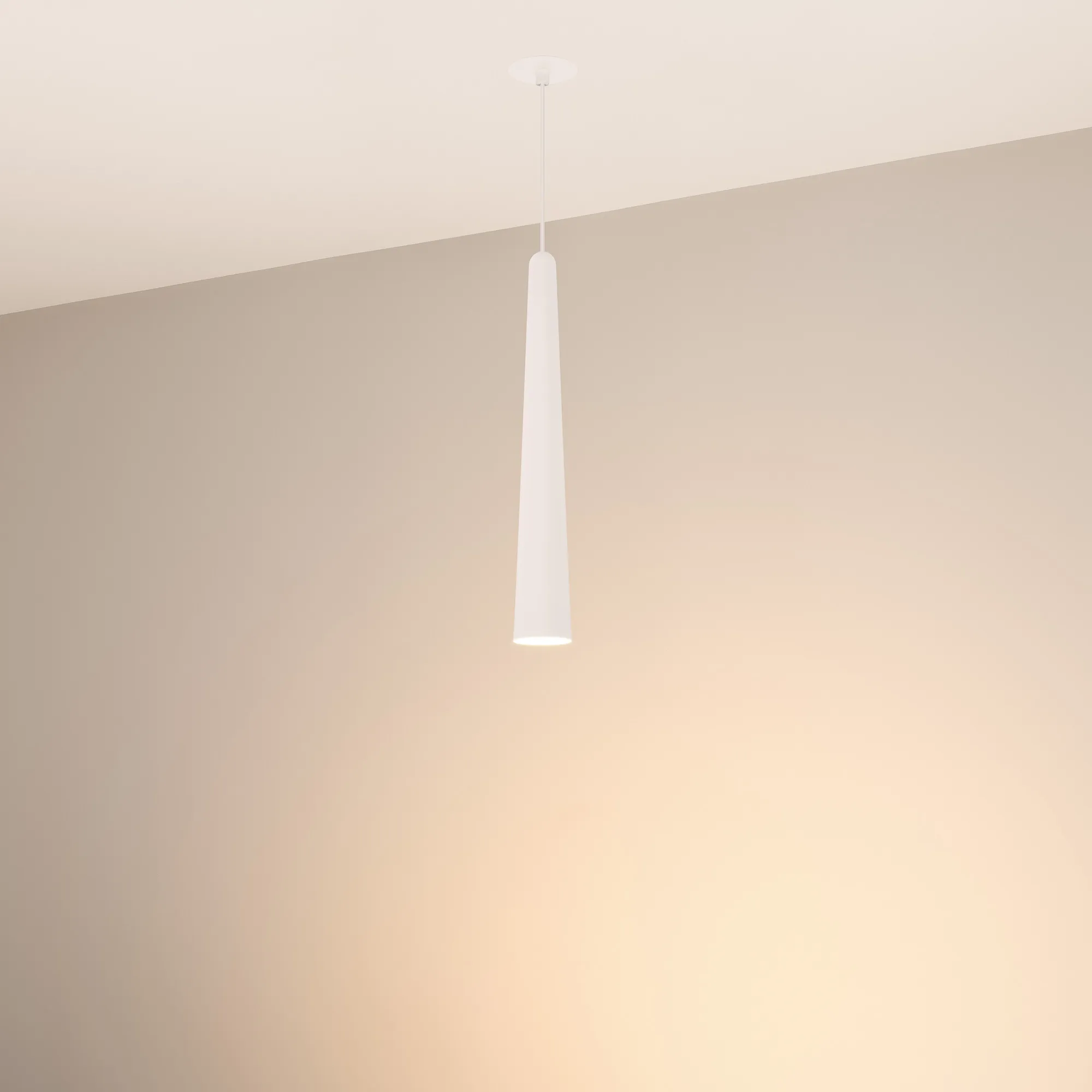 Подвесной светильник. Мощность 5 Вт, св. поток 400 лм, световая эффективность 70 лм/Вт, теплый 2700 K, CRI>92, угол 36°, напряжение питания 230 В. Белый конусообразный вытянутый корпус из алюминия, линза из PMMA, степень защиты IP20. Размер: диаметр 57 мм, высота 400 мм. Монтаж подвесной, длина подвеса 2000 мм, регулируемая. В комплекте 2 вида чаш. Габариты встраиваемой чаши: Ø 80x41 мм. Габариты накладной чаши Ø80x60 мм. Драйвер 2,8-12В, 500 мА, пульсация <1%.