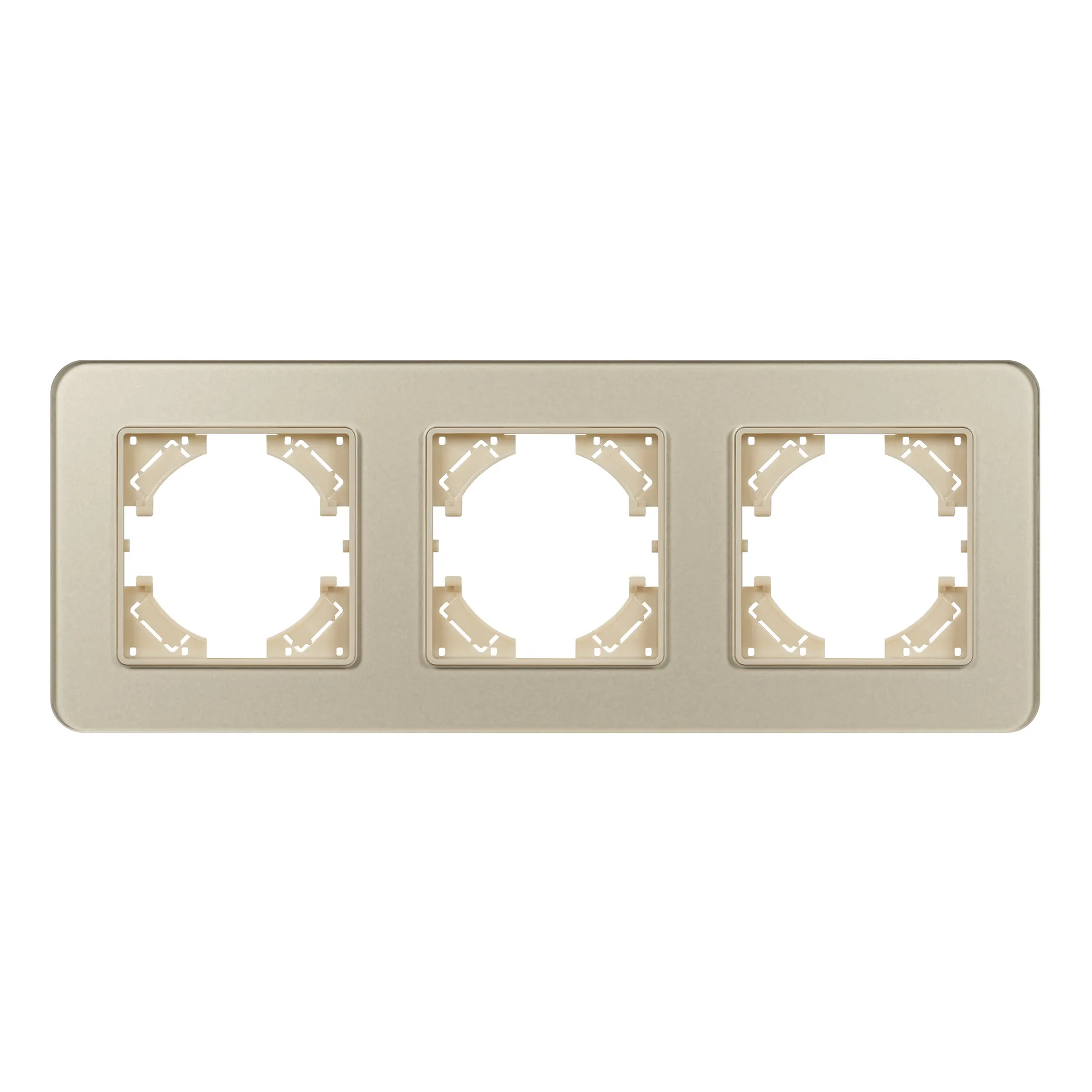Рамка стеклянная на 3 поста, под встраиваемый механизм. Цвет - золотой с Soft-Touch покрытием. Уровень герметичности IP20. Ориентация монтажа - горизонтальная (основным ориентиром служат посадочные выступы для накладки механизма).