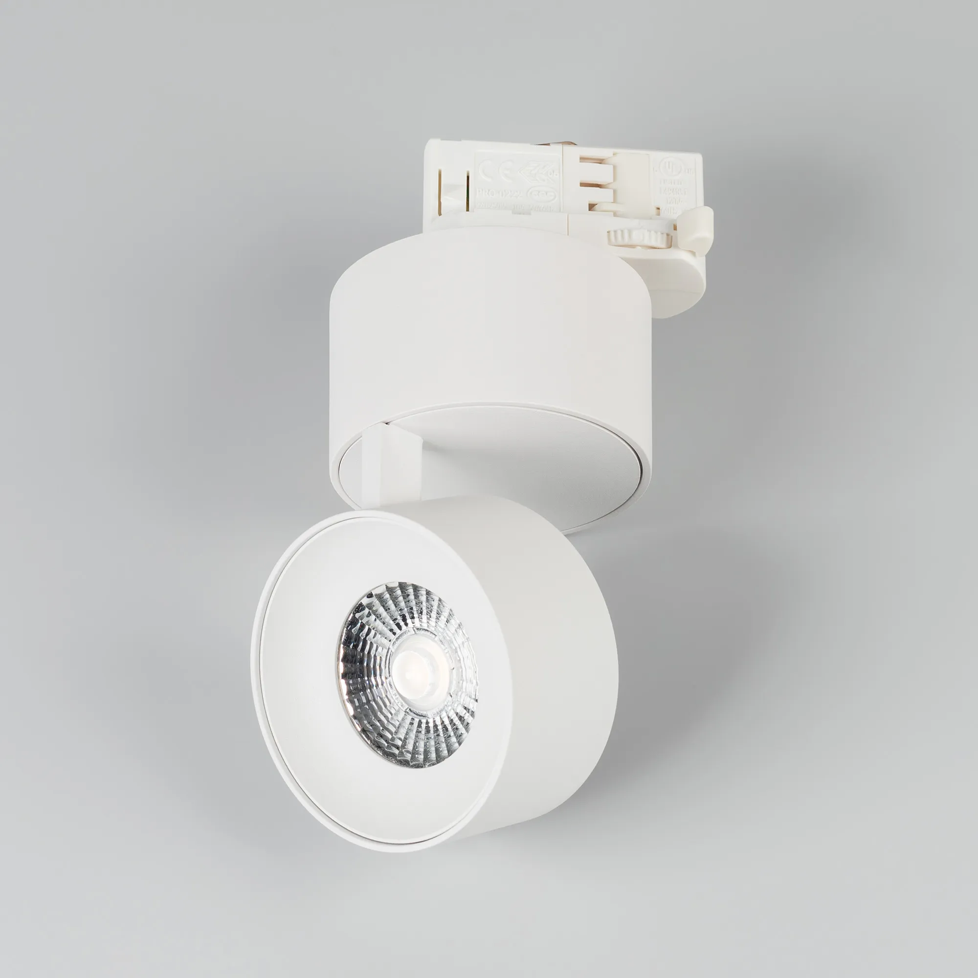 Светильник подвесной для треков/шин 4 провода. Мощность 9 Вт, св. поток 580 лм, 64 лм/Вт, дневной 4000 K, CRI>90, угол 36°, напряжение питания 230 В. Модуль белого цвета, белый круглый корпус из алюминия, степень защиты IP20. Размеры корпуса: длина адаптера 86 мм, ширина 32 мм, высота 38,2 мм., высота основания 46 мм. Размер светодиодного модуля: диаметр 77 мм, высота 59 мм. Монтаж на трек 3-фазный. Драйвер 38 В, 200 мА, пульсация <1%.